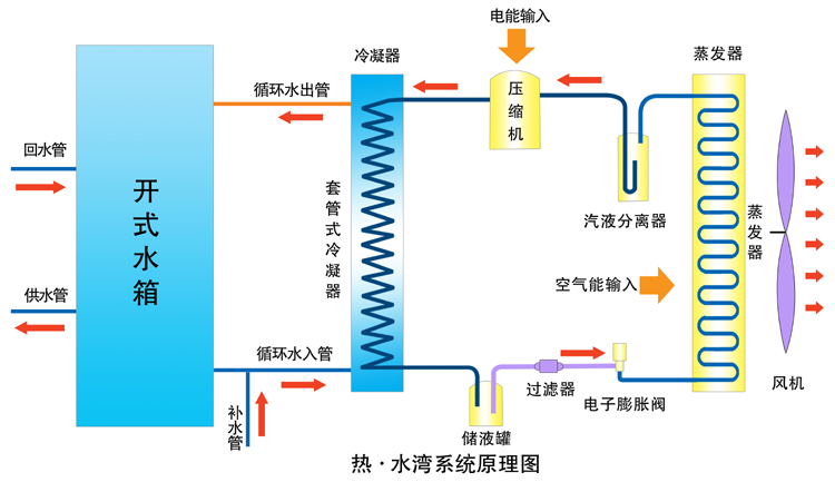 商用空氣能熱水器依據(jù)“逆卡諾”原理工作,以制冷劑為載體,將室外環(huán)境空氣的熱量,源源不斷的輸送到水側(cè)換熱器,再將熱量傳遞到水中,供給用戶以滿足生活熱水的需求。
