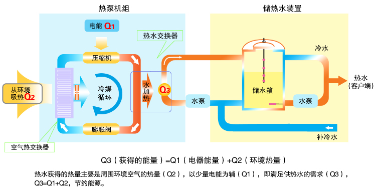 商用空氣能熱水器依據(jù)“逆卡諾”原理工作,以制冷劑為載體,將室外環(huán)境空氣的熱量,源源不斷的輸送到水側(cè)換熱器,再將熱量傳遞到水中,供給用戶以滿足生活熱水的需求。